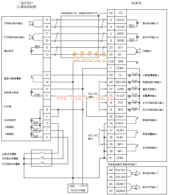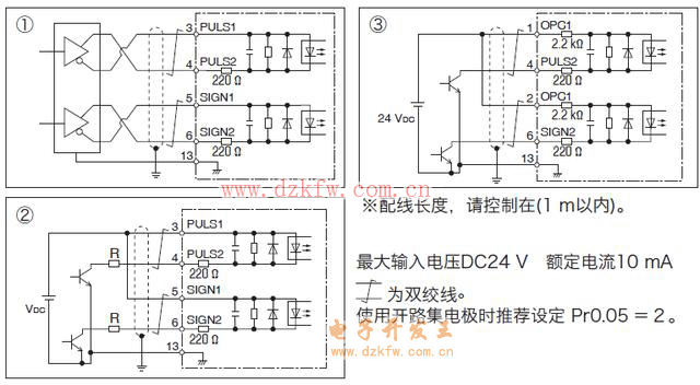 方式1,若PLC信號為差分方式輸出,則可以使用方式1,其優(yōu)點信號抗干擾能力強,可進行遠距離傳輸。若驅(qū)動器與PLC之間的距離較遠,則推薦使用此種方式。