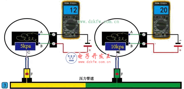 圖3,假設我們管道上安裝的是一塊量程為0-10kpa的壓力變送器,我們讓一個電源的正極接壓力變送器的B點,負極串聯一塊萬用表到壓力變送器的A點,并將萬用表打到電流檔。然后我們先看圖3的左面,當壓力變送器C點的壓力是5kpa時,萬用表的的電流讀數是12mA。正好是4-20mA的電流信號的中間值,而5kpa也正好是0-10kpa壓力值的中間值。再看圖3右邊,當壓力變送器C點的壓力是10kpa時,萬用表的的電流讀數正好是20mA。這樣0-10kpa壓力值就對應了4-20mA的電流信號值,我們只要在遠方通過一個接收設備把這個4-20mA的電流信號值提取出來,再通過一定的計算,就能知道就地的壓力值是多少了。這個接收設備可以是PLC也可以是數顯儀表等。