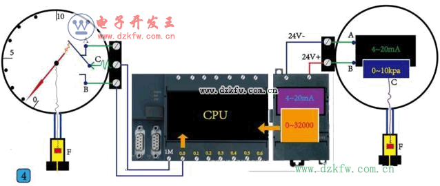 圖4,就是一個通過西門子s7-200 PLC讀取壓力變送器壓力值的接線圖例,這是一種最基本的使用方法,左邊是開關量的,右邊是模擬量的,不同的信號類型要接到PLC不同輸入端。