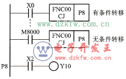 (1)在圖6-13中,若X0=1,程序跳轉到標號P8處;X0 =0,則順序執行程序,這是有條件轉移。若執行條件為M8000,則稱為無條件跳轉,因為M8000觸點在PLC通電運行時就自動接通。