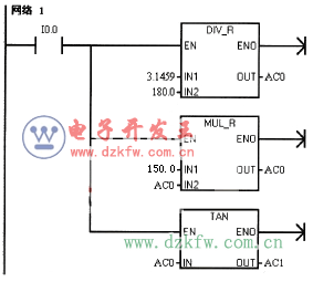 三角函數運算指令的例子如圖4-10所示。當I0.0接通,3.1459/180.0送到AC0,然后150.0×AC0=AC0,最后對AC0的值求正切值,送到AC1。