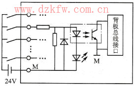 圖1是直流輸入模塊的內(nèi)部電路和外部接線圖,圖中只畫出了一路輸入電路,M或N是同一輸入組內(nèi)各內(nèi)部輸入電路的公共點(diǎn)。當(dāng)圖1中的外部電路接通時(shí),光耦合器中的發(fā)光二極管( LED)點(diǎn)亮,光敏三極管飽和導(dǎo)通;外部電路斷開時(shí),光耦合器中的LED熄滅,光敏三極管截止,信號(hào)經(jīng)背板總線接口傳送給CPU模塊。