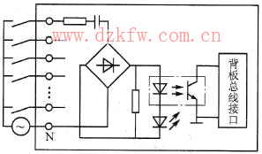 交流輸入模塊的額定輸入電壓為AC 120 V或230 V。圖2的電路用電容隔離輸入信號(hào)中的直流成分,用電阻限流,交流成分經(jīng)橋式整流電路轉(zhuǎn)換為直流電流。外部電路接通時(shí),光耦合器中的發(fā)光二極管和顯示用的發(fā)光二極管點(diǎn)亮,光敏三極管飽和導(dǎo)通。外部電路斷開時(shí),光耦合器中的發(fā)光二極管熄滅,光敏三極管截止,信號(hào)經(jīng)背板總線接口傳送給CPU模塊。