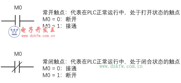 M是最常用的輔助繼電器,其只有OFF(0)和ON(1)兩種狀態,和通常我們接觸到的中間繼電器一樣,在梯形圖中,又分為常開觸點和常閉觸點