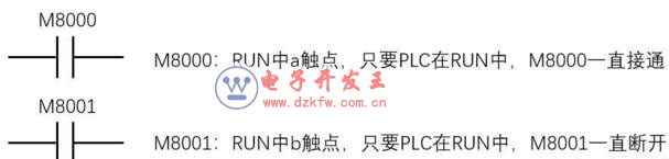 M8000是一直接通(ON)的,M8001是一直閉合(OFF)的