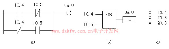 如果兩個觸頭剛好組成示的控制線路,則形成了邏輯異或關系。相應的異或指令XOR重要性不如前述五條指令,雖然XOR指令使用時可以提供一些便利,但其邏輯結果用前述五條指令的組合也可實現。