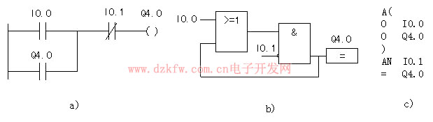 例:電動機起停控制基本環節,編程元件地址分配為:起動按鈕SB1—常開觸頭I0.0、停止按鈕SB2—常閉觸頭I0.1、接觸器線圈KM—Q4.0。請分別給出梯形圖、功能圖塊和語句指令程序。