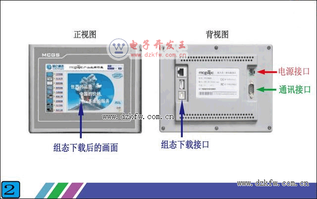 那觸摸屏和PLC通訊的原理是什么樣的呢?看下面的圖2,這是一個真實的觸摸屏的正面和背面,正面不用說了,就是顯示面。主要看一下背面,有3個接口。