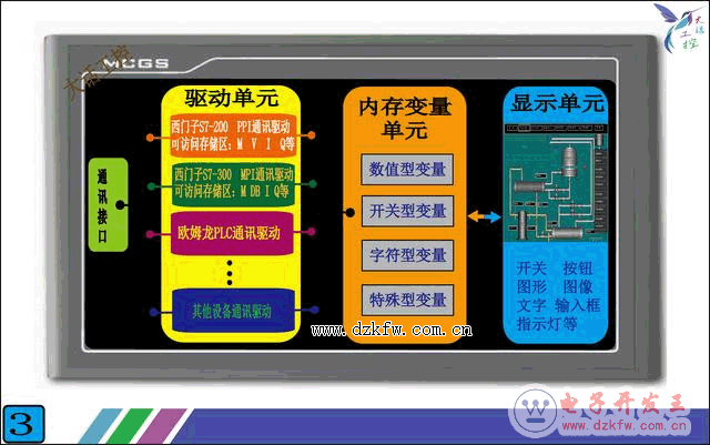 4,顯示單元:這個單元就好理解了,只要是我們在觸摸屏畫面上能看到的東西都是在顯示單元。就依上面的'鍋爐水溫'為例,我們想要顯示鍋爐的水的溫度,只要在觸摸屏的顯示單元上,畫一個顯示框的部件(這個部件每個觸摸屏都有,直接拖到畫面就行),然后把這個部件和上面新建的'鍋爐水溫'這個變量連接起來就行了。