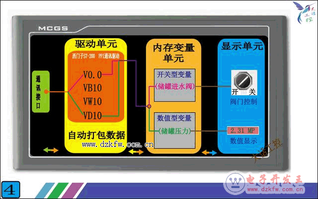 比如我們想要在觸摸屏上顯示一個鍋爐的水溫,那么我們就在觸摸屏的內存變量單元,新建一個變量,這個變量的名字叫'鍋爐水溫'(名字隨便取),數據類型選擇數值型。那么觸摸屏就會自動在內存單元,分配一小塊區域給'鍋爐水溫'這個變量。當觸摸屏和PLC通訊時,就會把從PLC讀到水溫數據存放到這一小塊區域,也就是'鍋爐水溫'這個變量。當我們需要顯示多個數據時,只要新建多個變量就可以了。看到這里你可能還是有點不太理解,沒關系,等一會我按照下面的圖4系統的說一下你就明白了。