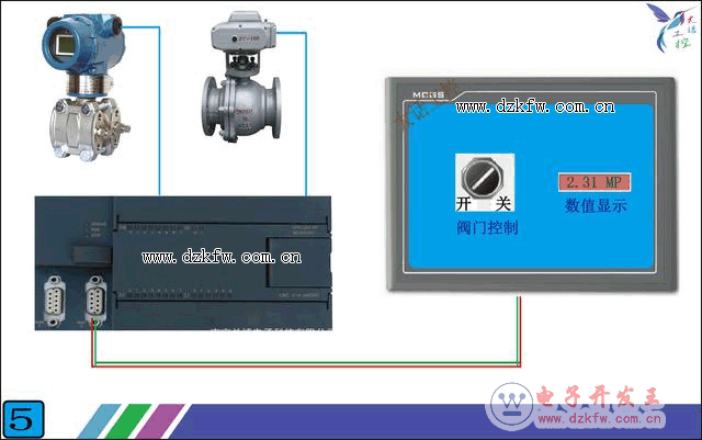 圖4要實現的功能是,觸摸屏和西門子S7-200PLC連接,1,在觸摸屏上可以顯示PLC里的一個壓力數值,。2,可以通過觸摸屏上的一個開關部件,控制PLC里的一個開關量。