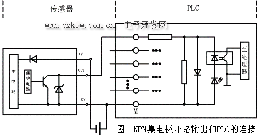 由以上分析可知,NPN集電極開路輸出為0V,當輸出OUT端和plc輸入相連時,電流從PLC的輸入端流出,從PLC的公共端流入,此即為PLC的漏型電路的形式,即:NPN集電極開路輸出只能接漏型或混合式輸入電路形式的PLC,連接圖如圖1所示: