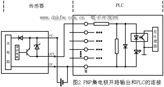 PNP集電極開路輸出為+V高電平,當輸出OUT端和PLC輸入相連時,電流從PLC的輸入端流入,從PLC的公共端流出,此即為PLC的源型電路的形式,即:PNP集電極開路輸出只能接源型或混合型輸入電路形式的PLC,連接圖如圖2所示: