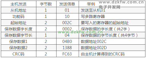 例如:主機(jī)要把數(shù)據(jù)07D0,保存到地址為002C的從機(jī)寄存器中去(從機(jī)地址碼為01)。通訊數(shù)據(jù)保存結(jié)束后,地址為002C的PDM表原存儲(chǔ)信息為: