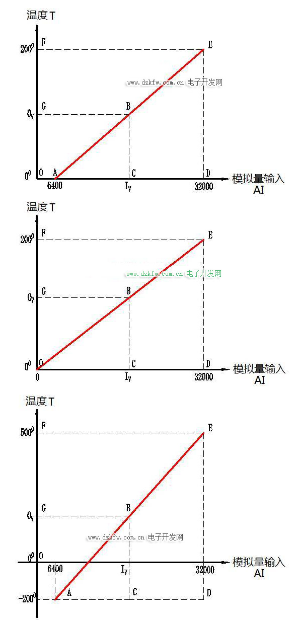 3)測溫范圍為-200—500°,變送器輸出信號為4—20mA,對應的數字量范圍為6400—32000;