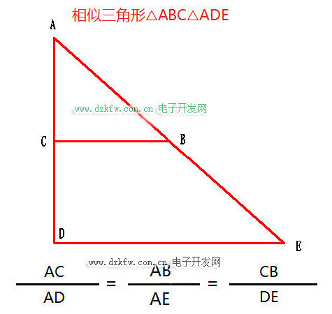 可以利用相似三角形的原理進行分析,兩個相似三角形的對應邊成比例,如下圖所示: