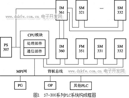西門子S7-300系列PLC是模塊化結構設計,各種單獨模塊之間可進行廣泛組合和擴展。其系統構成如圖1所示。它的主要組成部分有導軌(RACK)、電源模塊(PS)、中央處理單元模塊(CPU)、接口模塊(IM)、信號模塊(SM)、功能模塊(FM)、通信處理器(CP)等。它通過MPI網的接口直接與編程器PG、操作員面板OP和其它S7 PLC相連。