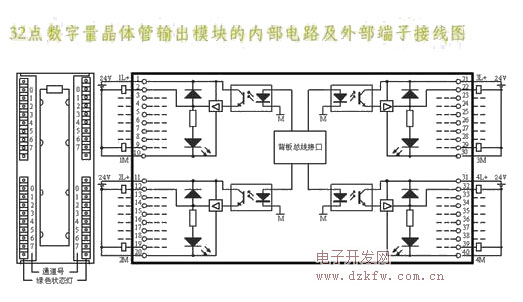 下面我們來(lái)看32點(diǎn)數(shù)字量晶體管輸出模塊的內(nèi)部電路及外部端子的接線圖。晶體管輸出模塊只能帶直流負(fù)載,所以它的工作電源是直流24V的。例如,2號(hào)端子是一個(gè)輸出點(diǎn),接一個(gè)線圈,線圈另一端接24V電源的負(fù)端同時(shí)接10號(hào)端子1M,1號(hào)端子1L+接電源的正極。1號(hào)端子和10號(hào)端子是2號(hào)端子到9號(hào)端子這8個(gè)輸入點(diǎn)的共用端子。11號(hào)端子和20號(hào)端子是12號(hào)端子到19號(hào)端子的共用端子。其它端子接線類似。