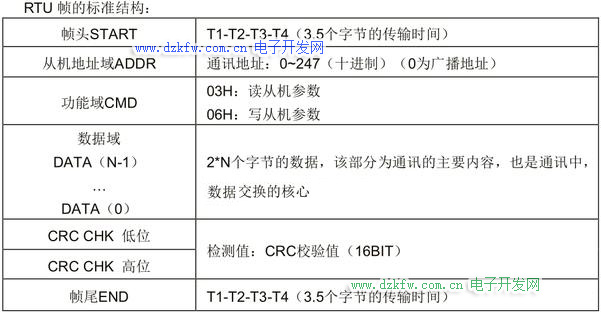 在 RTU 模式中,新幀總是以至少 3.5 個字節的傳輸時間靜默作為開始。在以波特率計算傳輸速率的網絡上,3.5 個字節的傳輸時間可以輕松把握。緊接著傳輸的數據域依次為:從機地址、操作命令碼、數據和 CRC 校驗字,每個域傳輸字節都是十六進制的 0…9,A…F。網絡設備始終監視著通訊總線的活動。當接收到第一個域(地址信息),每個網絡設備都對該字節進行確認。隨著最后一個字節的傳輸完成,又有一段類似的 3.5 個字節的傳輸時間間隔,用來表識本幀的結束,在此以后,將開始一個新幀的傳送。