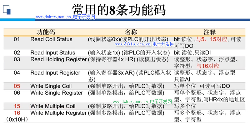 由于上述各類地址是唯一對應的,因此有些資料就以其第一個數字區分各類地址,即:0x代表線圈(DO)類地址,1x代表觸點(DI)類地址、 3x代表輸入寄存器(AI)類地址、4x代表輸出寄存器(AO)類地址。
