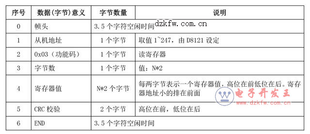 正常響應幀格式:從機地址+0x03+字節數+寄存器值+CRC 檢驗