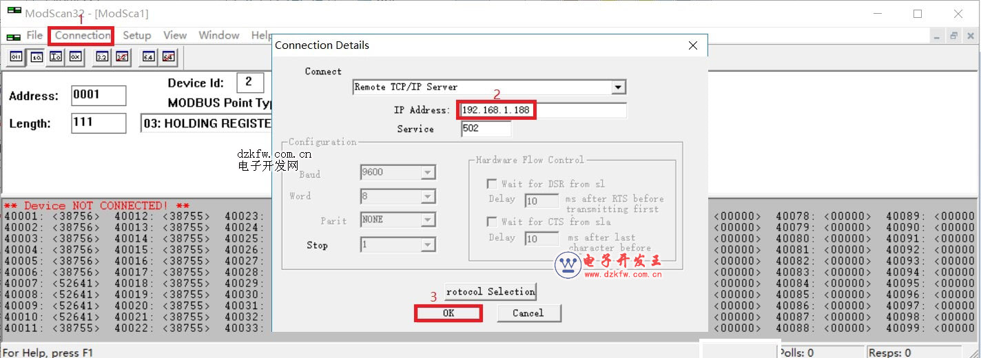 選擇菜單欄【Connection】--Connect,在對(duì)話框中的【IP Address】處輸入?yún)f(xié)議轉(zhuǎn)換網(wǎng)關(guān)的IP地址,點(diǎn)擊【OK】按鈕;