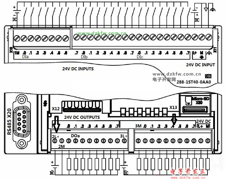 下面這張圖是ST40的接線示意圖,從圖中可以清楚的看到模塊的供電、數字量輸入、數字量輸出及模塊向外輸出24V電源的接線方式。