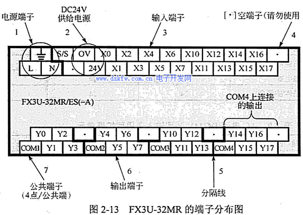 在講解 FX3U 系列 PLC 基本模塊前,先要熟悉基本模塊的接線端子。FX 系列的接線端子(以 FX3U-32MR 為例)一般由上下兩排交錯分布,如圖2-13所示,這樣排列方便接線,接線時一般先接下面一排(對于輸入端,先接 X0.X2、X4.X6… 接線端子,后接 X1.X3.X5.X7… 接線端子)。