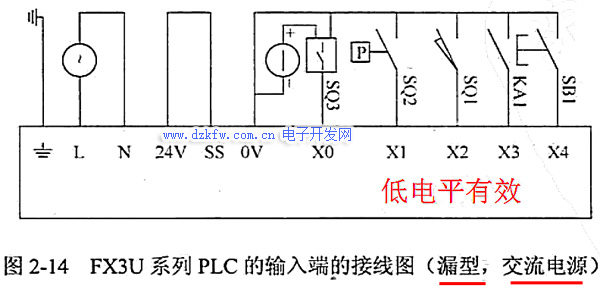 如圖2-14所示,模塊供電電源為交流電,輸入端是漏型接法, 24V端子與SS端子短接,0V端子是輸入端的公共端子,這種接法是低電平有效,也叫NPN輸入。