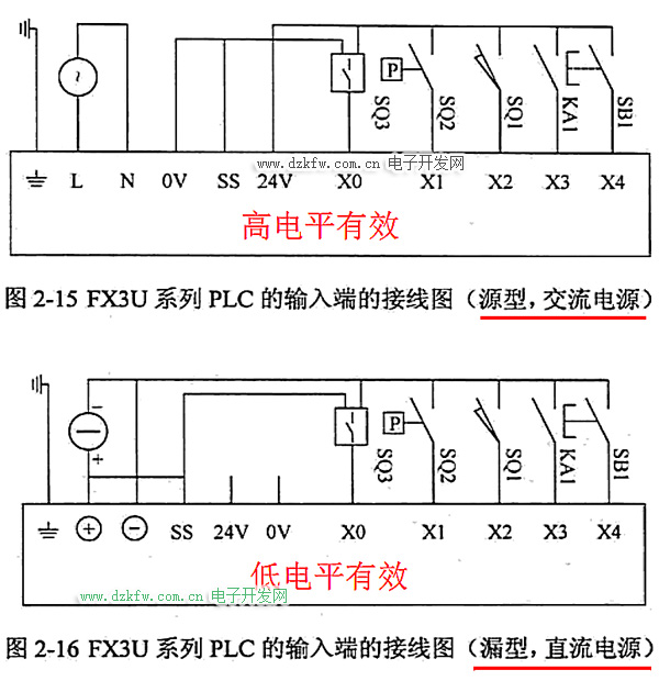 如圖2-15所示,模塊供電電源為交流電,輸入端是源型接法, 0v端子與SS端子短接,24V端子是輸入端的公共端子,這種接法是高電平有效,也叫PNP輸入。