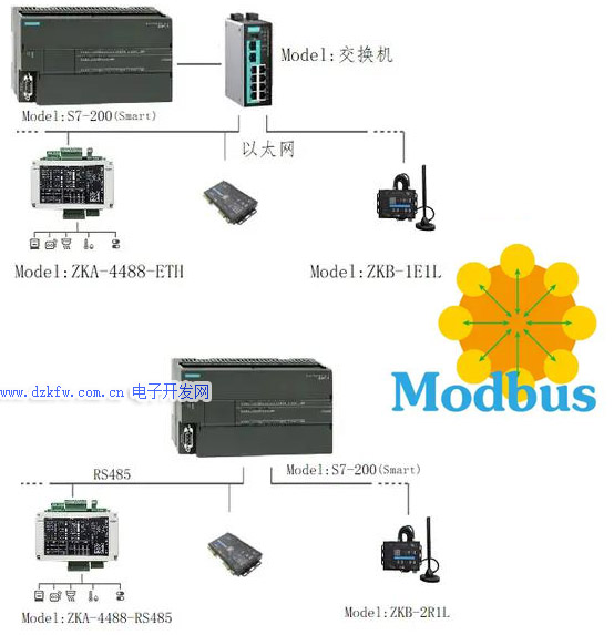 (2)Modbus可以支持多種電氣接口,如RS-232、RS-485等,還可以在各種介質上傳送,如雙絞線、光纖、無線等。