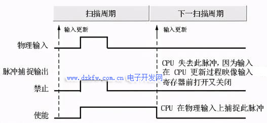 當為某一輸入點啟用脈沖捕捉時,輸入狀態的改變被鎖定,并保持至下一次輸入循環更新。 這樣可確保延續時間很短的脈沖被捕捉,并保持至 S7-200 SMART CPU 讀取輸入。