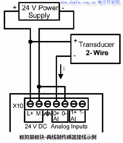 模擬量傳感器可以分為兩線制和四線制兩種。四線制傳感器有專門的電源線,而兩線制傳感器的一條線用來(lái)供電,另一條線用來(lái)傳輸模擬量信號(hào)。兩線制傳感器與模擬量模塊的接線示意圖如下: