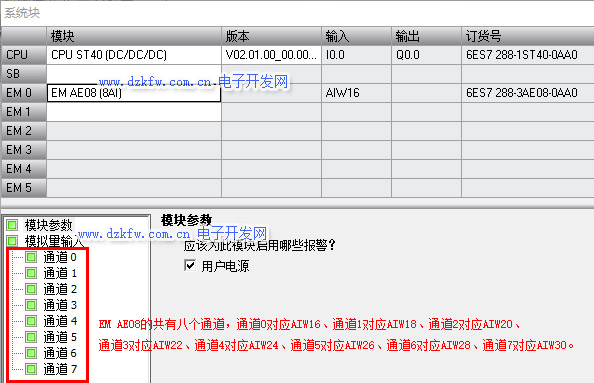 EM AE08的共有八個(gè)通道,通道0對(duì)應(yīng)AIW16、通道1對(duì)應(yīng)AIW18、通道2對(duì)應(yīng)AIW20、通道3對(duì)應(yīng)AIW22、通道4對(duì)應(yīng)AIW24、通道5對(duì)應(yīng)AIW26、通道6對(duì)應(yīng)AIW28、通道7對(duì)應(yīng)AIW30。