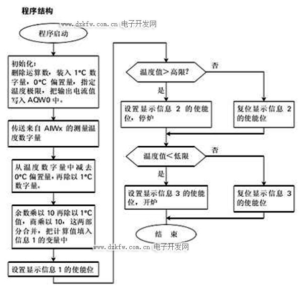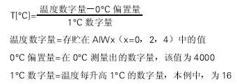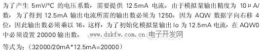 為了把PT100的隨溫度變化的電阻轉換成電壓,模擬量輸出作為恒電流源而使用,即輸出12.5mA隨電流供給PT100傳感器。在這個電路中,產生了5mV/0C的線性輸入電壓。EM235把這個電壓轉換成數字量,程序周期性地讀這些數字量,并將所讀的這些數,利用下面的公式計算出溫度。