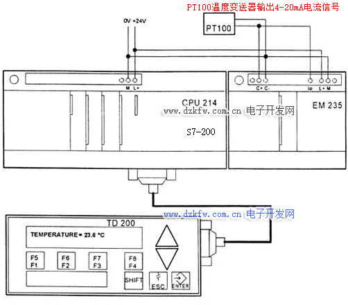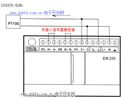 本例討論如下內容:用模擬量擴展模塊EM235測量溫度和監視指定溫限,在該模擬量模塊的一個輸入通道上連接PT100溫度傳感器。