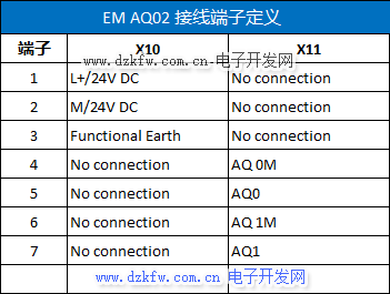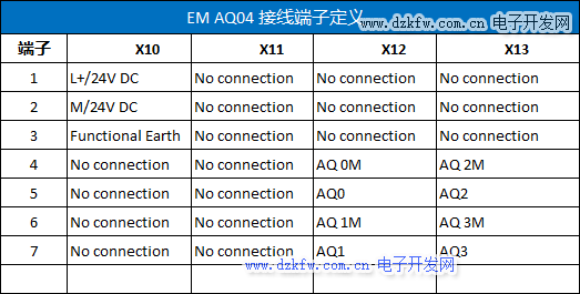 EM AQ04有四排接線端子,上面為X10和X11;下面為X12和X13。各接線端子的定義如下表: