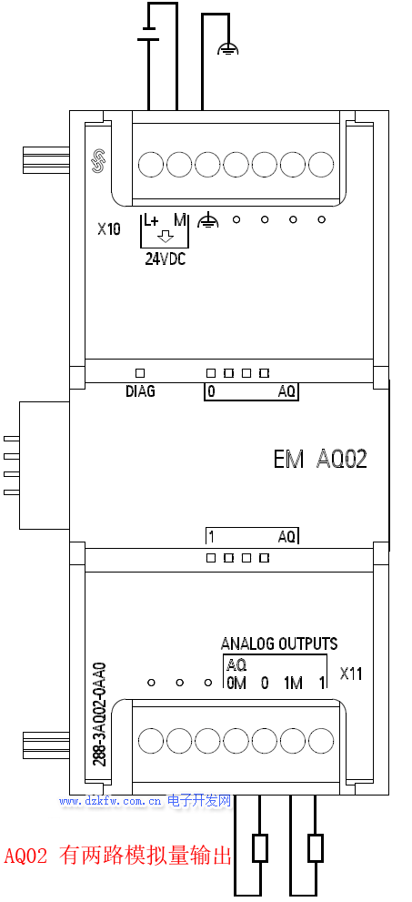 EM AQ02有兩路模擬量輸出,可以輸出±10V的電壓信號(hào),或者0~20mA(4~20mA)的電流信號(hào);其外觀如下圖: