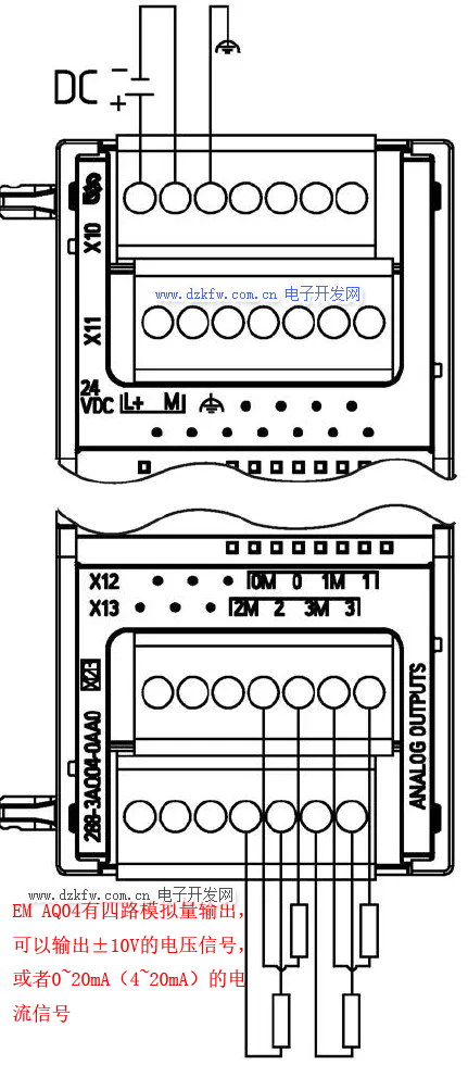 另一款模擬量輸出模塊EM AQ04有四路模擬量輸出,可以輸出±10V的電壓信號(hào),或者0~20mA(4~20mA)的電流信號(hào);