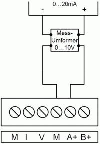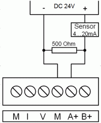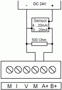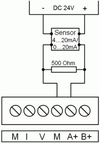 S7-224 XP 的兩路模擬量輸入通道被出廠設置為電壓信號(0-10V)輸入。為了能夠輸入電流信號,必須在 A+ 與 M 端 (或 B+ 與 M 端) 之間并入一個500 歐姆的電阻。