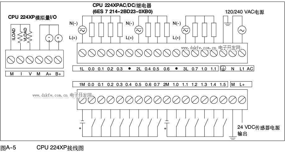 CPU 224 XP本體集成的模擬量I/O接線圖如下:
