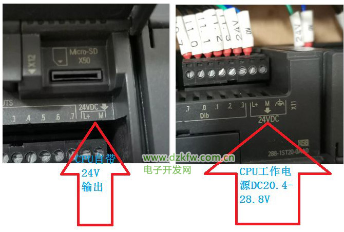 如上圖所示 L+與DC24V正極接一起,M端和DC24V負(fù)極接一起,這樣CPU的供電就完成了。