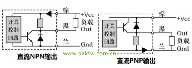 常用的接PNP或NPN型傳感器為三線制的居多(如下圖所示)棕色和藍(lán)色分別表示24V的正負(fù)極,黑色表示信號(hào)的輸出;從圖中可看出,NPN型在導(dǎo)通時(shí),黑色和藍(lán)色類似于連接在一起,輸出黑色線接PLC輸入點(diǎn)時(shí)為0V,所以信號(hào)輸出為低電平,也稱之為源型輸入(共陽(yáng)極輸入) 而對(duì)于PNP型來說導(dǎo)通時(shí),黑色和棕色類似于連接在一起,輸出黑色線接PLC輸入點(diǎn)時(shí)為24V,所以信號(hào)輸出為高電平,也稱之為漏型輸入(共陰極)