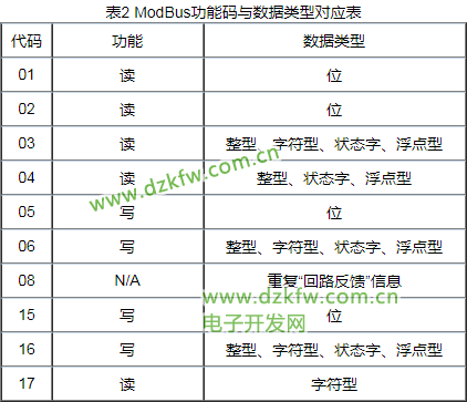 Modbus網絡是一個工業通信系統,由帶智能終端的可編程序控制器和計算機通過公用線路或局部專用線路連接而成。其系統結構既包括硬件、亦包括軟件。它可應用于各種數據采集和過程監控。下表1是ModBus的功能碼定義。