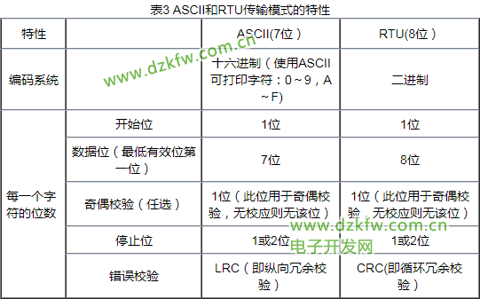 在ModBus系統中有2種傳輸模式可選擇。這2種傳輸模式與從機PC通信的能力是同等的。選擇時應視所用ModBus主機而定, 每個ModBus系統只能使用一種模式,不允許2種模式混用。一種模式是ASCII(美國信息交換碼),另一種模式是RTU(遠程終端設備)這兩種模式的 定義見表3
