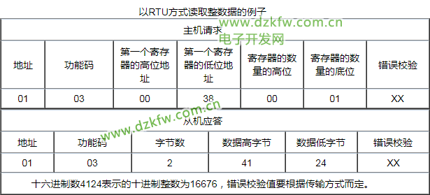 用RTU模式傳輸的數據是8位二進制字符。如欲轉換為ASCII模式,則每個RTU字符首先應分為高位和低位兩部分,這兩部分各含4位,然后轉換成十六進 制等量值。用以構成報文的ASCII字符都是十六進制字符。ASCII模式使用的字符雖是RTU模式的兩倍,但ASCII數據的譯瑪和處理更為容易一些, 此外,用RTU模式時報文字符必須以連續數據流的形式傳送,用ASCII模式,字符之間可產生長達1s的間隔,以適應速度較快的機器。表4給出了以RTU 方式讀取整數據的例子
