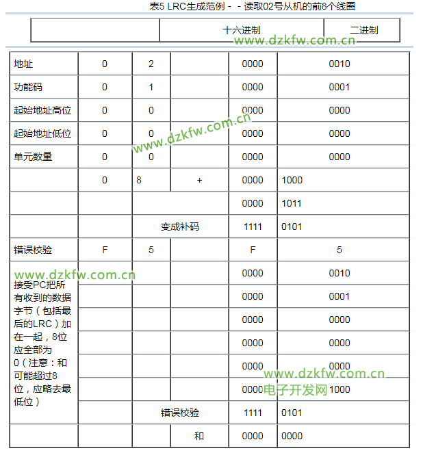 表5 LRC生成范例--讀取02號從機的前8個線圈
