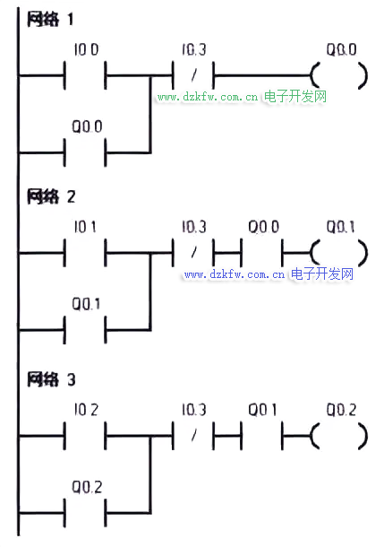2. 單向順序停止控制電路就是要求按一定順序停止已經執行的各機構。只有 Q0.2停止后才可以停止 Q0.1,若想停止 Q0.0,則必須先停止 Q0.1。I0.4 為急停按鈕。