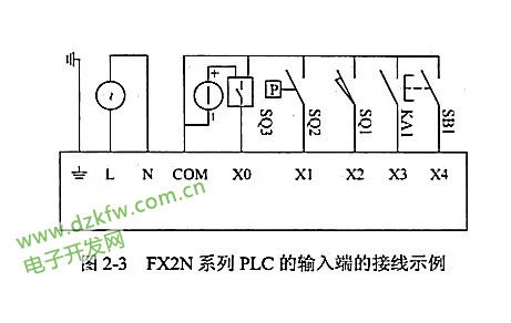 ▲ FX2N 系列 PLC 的輸入端的接線示例:可見輸入端電源的負(fù)極與 COM 公共端短接。