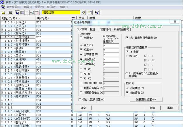 交叉參考表給出了S7用戶程序使用的地址的概況,顯示I、Q、M、T、C、FB、FC、SFB、SFC、PI/PQ和DB的絕對地址、符號地址以及使用情況,在類型列的R和W分別表示讀和寫。塊列是變量所在的邏輯塊,位置列給出了變量在邏輯塊中的位置和指令,如下圖所示